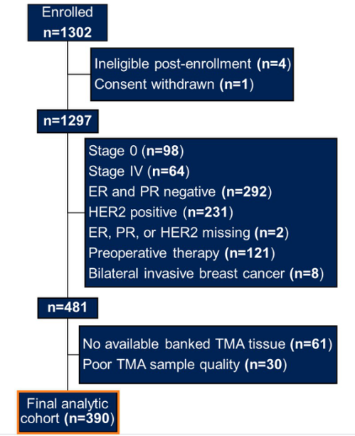 研究背景:包括小于40岁患者在内的三阴性乳腺癌患者中,TILs的增加与更好的预后相关。然而,在HR+/HER2-乳腺癌中TILs的作用仍不清楚,并且在年轻患者中几乎没有相关数据,这类患者的免疫微环境可能因年龄相关的宿主/肿瘤差异而发生改变。本研究评估了HR+的年轻女性乳腺癌患者中免疫细胞浸润的程度和组成,并探讨其与临床病理特征和生存结果的相关性。