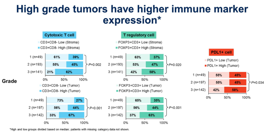 组织学3级肿瘤的间质内和肿瘤内具有较高表达的CD3+CD8-(P=0.002;P<0.001)和FOXP3+CD3+(P=0.020;P<0.001)TILs。根据怀孕时间的远近程度、BRCA1/2状态或T/N分期进行分层后,TILs无显著差异。