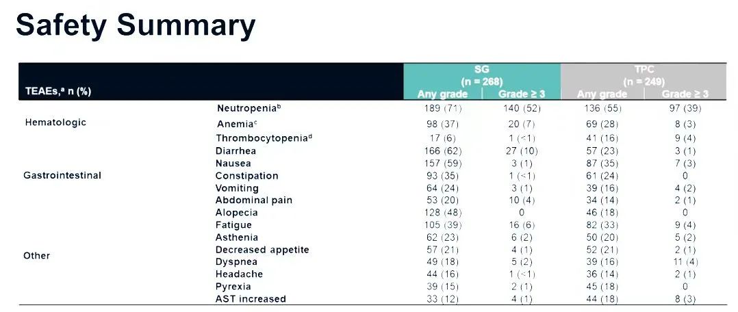 SG最常见的不良反应是中性粒细胞减少,其次是腹泻。在晚期三阴性临床研究ASCENT中进行的一项分析,探索了UGT1A1基因多态性和药物毒性的关系,我们发现UGT1A1基因型与中性粒细胞减少有关,但由于整体可防可控、无需在治疗前对患者进行基因型检测及筛选。