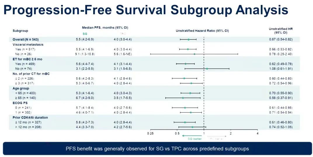 如果患者预先未接受CDK4/6抑制剂治疗,相比于后续化疗,患者更有可能会在SG治疗中实现更多获益。我们一直以来建议患者都先接受CDK4/6抑制剂治疗是因为我们将其视为一个治疗标准,却忽视了它本身具有的多样性和包容性,因为一些其他国家的患者没有经济能力去承担这个未纳入医保的药物。所以,将这些预先未接受CDK4/6抑制剂治疗的患者纳入试验很重要。