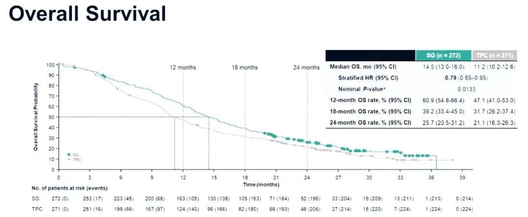 既往结果证明,SG能显著改善患者的无进展生存期和总生存期。基于这些数据,FDA批准其用于治疗不可切除局部晚期或转移性激素受体(HR)阳性、人表皮生长因子受体2(HER2)阴性(IHC 0、IHC 1+或IHC 2+/ISH-)乳腺癌。此次我们在ASCO大会上呈现的结果包括了(与以往研究结果相比)更长的随访期数据,同时还有最终总生存期结果。此外,额外的六个月随访数据表明,患者生存期保持稳定,这对于我们来说是一个积极的信号,表明没有新的药物毒性产生。