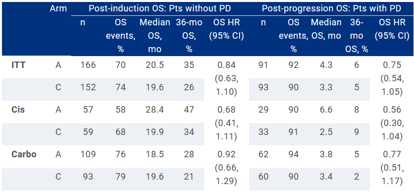 最后一个患者入组至数据截止日期(2022年8月31日)已有49个月(ITT总人群)。相比于队列C,队列A使用顺铂的OS改善优于卡铂方案。在顺铂亚组中,对于在诱导期间至少达到SD的患者,36个月的OS率分别为47%(队列A)和34%(队列C);下表列出了详细的疗效数据。事后分析表明,诱导治疗的初始肿瘤响应似乎并不影响阿替利珠单抗的OS改善。与既往分析一致,这些数据表明相比于卡铂治疗,顺铂治疗联合阿替利珠单抗的获益可能更大。
