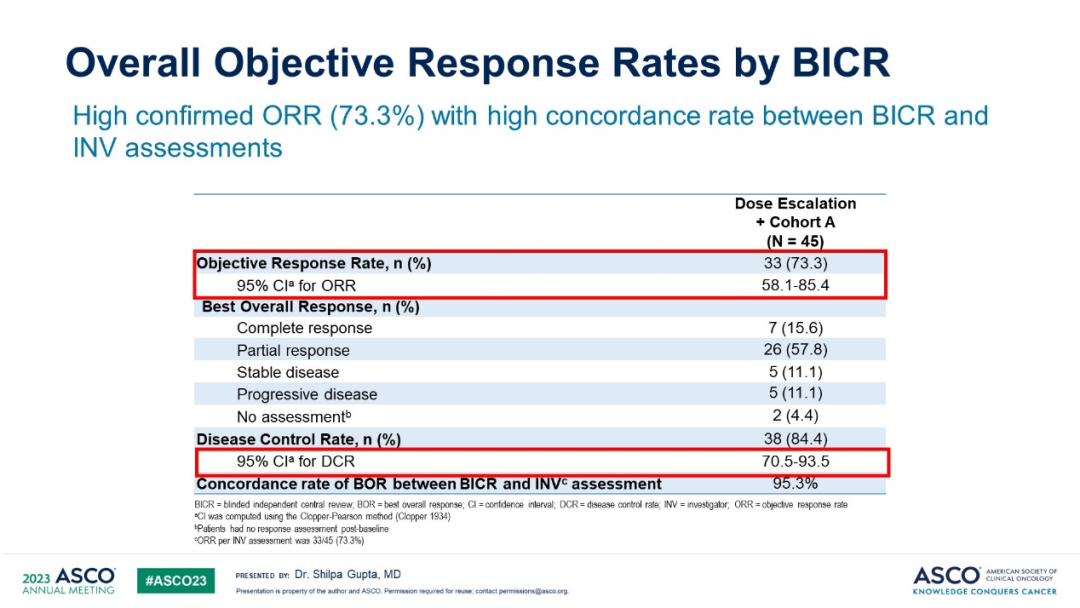 截至到2022年9月16日,共有45例la/mUC患者(中位年龄69岁)接受了治疗。所有患者均已停止治疗,但仍有18例患者继续在研究中(中位随访47个月)。中位9个周期治疗后,BICR评估的cORR为73.3%,DCR为84.4%,CR比例为15.6%。中位DOR为22.1个月,12个月DOR为63.9%。中位PFS为12.7个月,12个月PFS为55.0%。中位OS为26.1个月,12个月OS率为83.4%。