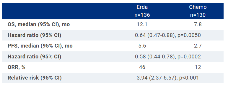 研究共纳入266例患者,136例患者接受厄达替尼治疗,130例接受研究选择的化疗。中位年龄为67岁;30%的患者既往接受过1线全身治疗,70%接受过2线全身治疗;74%存在内脏转移;90%为PD-L1低表达(CPS<10)。中位随访时间为15.9个月。研究达到了主要终点,厄达替尼显著提高了患者OS并将死亡风险降低了36%;中位OS为1年。与化疗相比,厄达替尼还显著改善了中位PFS(5.6个月vs 2.7个月)和ORR(46%vs 12%)。