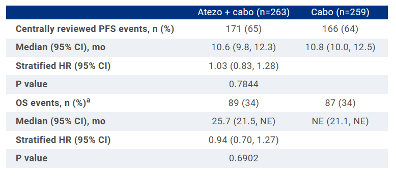 基于免疫检查点抑制剂(ICI)的治疗是转移性肾透明细胞癌的标准一线治疗。ICI治疗期间或治疗后疾病进展的治疗选择有限,仅有卡博替尼(cabo)等药物。CONTACT-03评估了在既往ICI治疗期间或之后发生进展的转移性RCC患者中,阿替利珠单抗(atezo)联合卡博替尼对比卡博替尼单药方案的疗效和安全性[6]。
