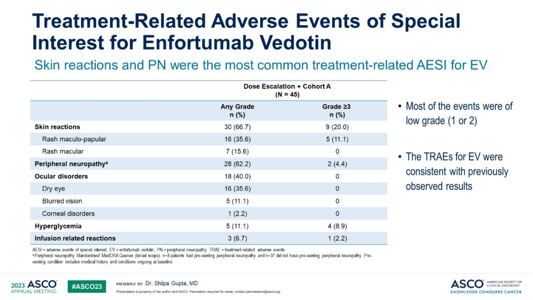 EV最常见的治疗相关不良事件是皮肤反应(66.7%)、周围神经病变(62.2%)和眼部疾病(40.0%)。P药最常见的治疗相关不良事件是严重的皮肤反应(24.4%)、肺炎(8.9%)、结肠炎(6.7%)和甲状腺功能减退(6.7%)。60%的患者随后接受了癌症相关治疗,包括全身治疗(48.9%)、手术(8.9%)和姑息性放疗(8.9%)。最常用的二线系统性抗肿瘤治疗方案包括P药(17.8%)、含卡铂的治疗(11.1%)和EV(6.7%)。