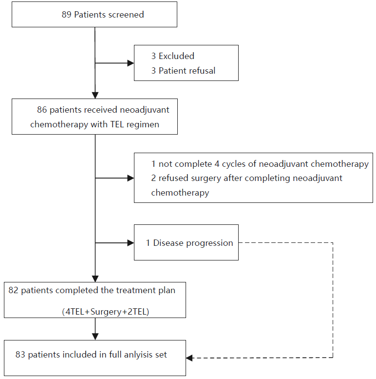 主要终点是总病理完全缓解率(tpCR:ypT0/Tis ypN0)和无事件生存期(EFS),次要终点为总生存期(OS)。本次研究共筛选了89例患者,最终83例患者纳入此次研究。