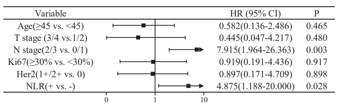 多变量cox回归模型分析表明NLR对EFS和OS有着重要的预测作用,NLR+组相对NLR-组有着更差的EFS和OS(P=0.028,0.047)。