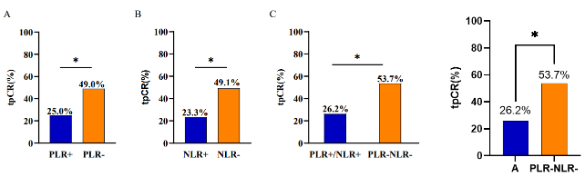 疗效:低血小板/淋巴细胞比例组(PLR-)tpCR率为49.0%(25/51),显著高于高血小板/淋巴细胞比例组(PLR+)的25.0%(8/32),低血小板/淋巴细胞比例组(NLR-)tpCR率为49.1%(26/53)同样显著高于高血小板/淋巴细胞比例组(NLR+)的23.3%(7/30)。两指标均为低比例的PLR-/NLR-组tpCR率为53.7%(22/41),明显高于任意指标为高比例的PLR+/NLR+组26.1%(11/42)。