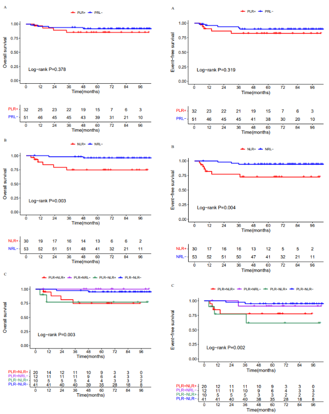 接下来我们对次要终点OS做了分析。NLR-组的EFS和明显优于NLR+组(P=0.003),PLR-/NLR-组有着很好的OS(P=0.003)。