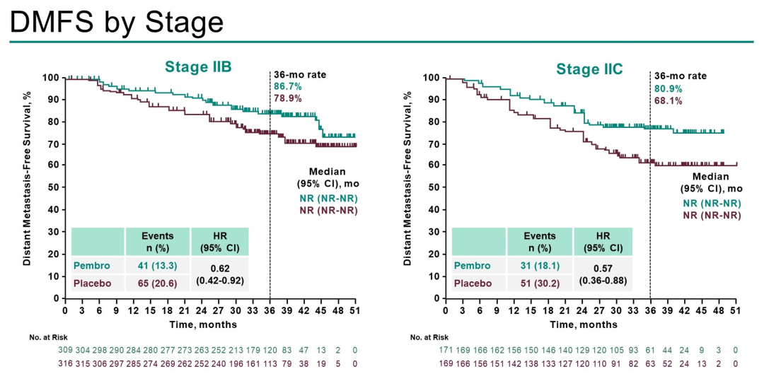 976例患者随机分配至帕博利珠单抗组(n=487)或安慰剂组(n=489)。中位随访时间(随机化至数据截止日期)为39.4个月(范围:26.0~51.4)。与安慰剂相比,帕博利珠单抗辅助治疗改善了患者的DMFS(中位DMFS:未达到;HR 0.59,95%CI:0.44~0.79)和RFS(中位RFS:未达到;HR 0.62,95%CI:0.49~0.79)。帕博利珠单抗辅助治疗的36个月DMFS率(84.4%vs 74.7%)和RFS率(76.2%vs 63.4%)更高。