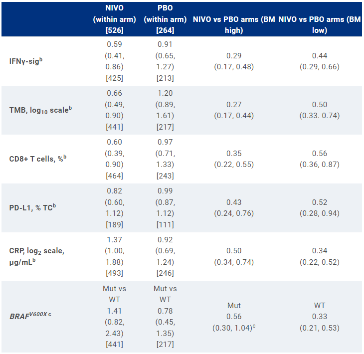 对治疗组内连续BM水平的分析显示,较高的IFNγ-sig、TMB、CD8+T细胞百分比以及较低的CRP水平与NIVO治疗的RFS延长有关,但与安慰剂无关。在二分类分析中也观察到同样的趋势。两种治疗方案中都没有发现PD-L1表达与RFS之间有明显的关联。在所有BM亚组中,NIVO均优于安慰剂,包括BRAFV600突变状态。对于IFNγ-sig、TMB、CD8+T细胞百分较高以及CRP水平较低的患者,使用NIVO治疗在数值上有更大的相对获益,尽管置信区间(CIs)有重叠。