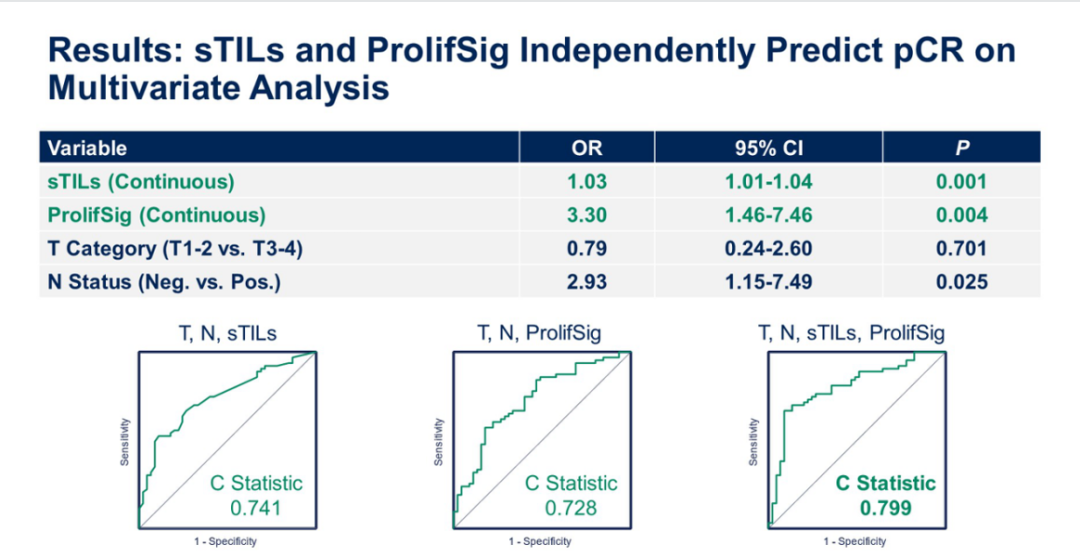 在多变量分析中,sTIL和ProlifSig是pCR的独立预测因子(sTIL,OR=1.02,95%CI:1.01~1.03,P=0.004;ProlifSig,OR=3.13,95%CI:1.44~6.83,P=0.004)。