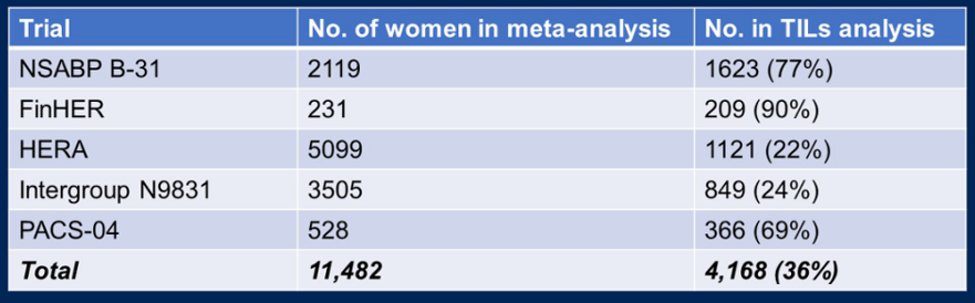 研究方法:入组5项随机对照试验(NSABP B-31、FinHER、HERA、Intergroup N9831、PACS-04)中4097名女性乳腺癌患者,并对其TILs进行量化。早期乳腺癌试验者协作组(EBCTCG)提供了所有试验中使用曲妥珠单抗治疗HER2阳性肿瘤女性患者的个体数据,对此进行荟萃分析,结果发现曲妥珠单抗治疗具有显著获益。依据国际指南对TILs进行评估,HERA试验使用数字TILs评分。主要终点是首次复发的时间。针对试验、治疗分配和淋巴结状态使用Cox回归分析进行调整,用于量化TILs的预后价值,标准分层对数秩检验用于评估曲妥珠单抗治疗的不同效果。