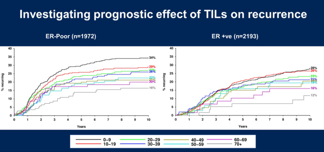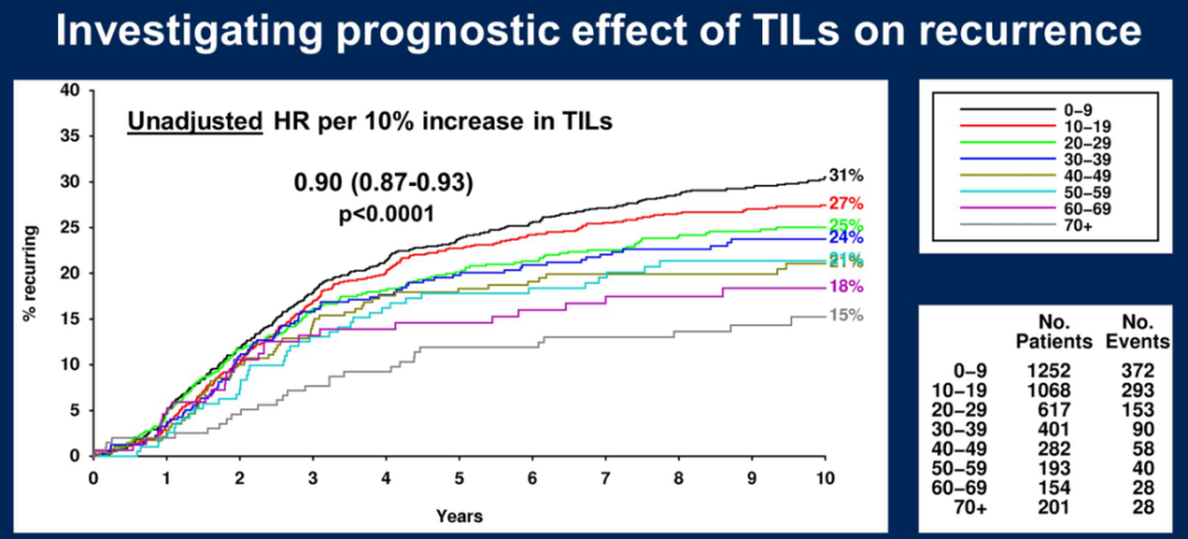 研究结果:TILs的中位数百分比为13%(IQR:5~30),不足10%的患者TILs为0.50%。结果证实了TILs的预后价值,TILs较高的患者复发风险较低(TILs每增加10%的校正后HR为0.87,95%CI:0.84~0.90,P<0.0001),两组治疗效果相似。随着TILs的增加,结果稳步改善,未校正的10年复发率从TILs<10%的30%下降到70%TILs的15%。因此,TILs的预测效果分析分为5组(0~9、10~19、20~39、40~59、60+)。