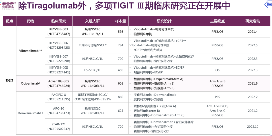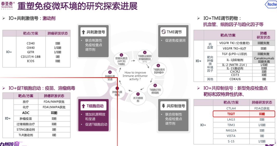 TIGIT是一种新型免疫检查点,可抑制T细胞激活,阻断TIGIT和PD-1可恢复共激活信号,也有利于解除Treg对T细胞的抑制作用,有望成为下一个突破点。代表研究如CITYSCAPE研究,它用于验证TIGIT可行性,另外还有多项Ⅲ期临床研究正在开展中,期待最终的结果,既能有更好的疗效,又能减少副作用,给患者带来更好的联合治疗选择。
