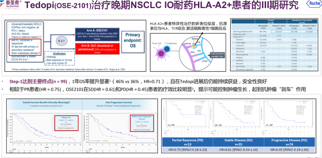 肿瘤疫苗的有效性评价中存在多种关键因素,抗原表位传播(Epitope Spreading)可以更好地平衡疫苗有效性的可行性和敏感性。一项HLA-A2+患者特异性治疗的新表位疫苗的III期研究结果提示,新抗原疫苗(OSE-2101)可能控制肿瘤生长,起到抗肿瘤“刹车”作用。另外,一种重组抗人表皮生长因子(EGF)疫苗联合纳武利尤单抗作为NSCLC二线治疗的II期研究结果显示,KRAS野生型NSCLC患者的中位OS最长,3年OS率为50%,毒性特征与Ⅰ期数据保持一致,没有新的临床问题。