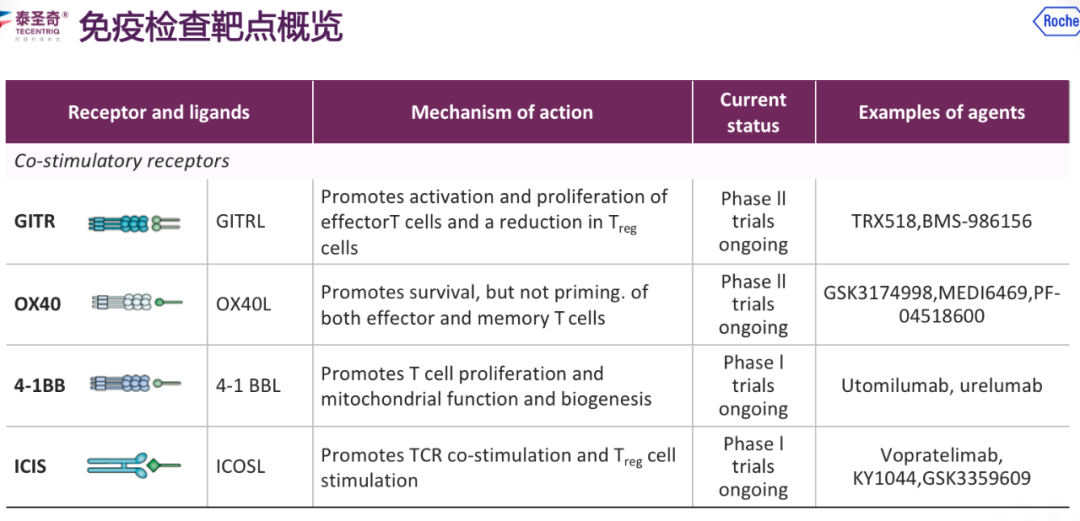 共刺激信号就是联合刺激性免疫检查点调节剂。免疫检查点的靶点较多,包括糖皮质激素诱导的肿瘤坏死因子受体(GITR)、肿瘤坏死因子受体4(OX40)、4-1BB、诱导性协同刺激分子(ICOS)等,肺癌相关研究仍处于早期阶段。