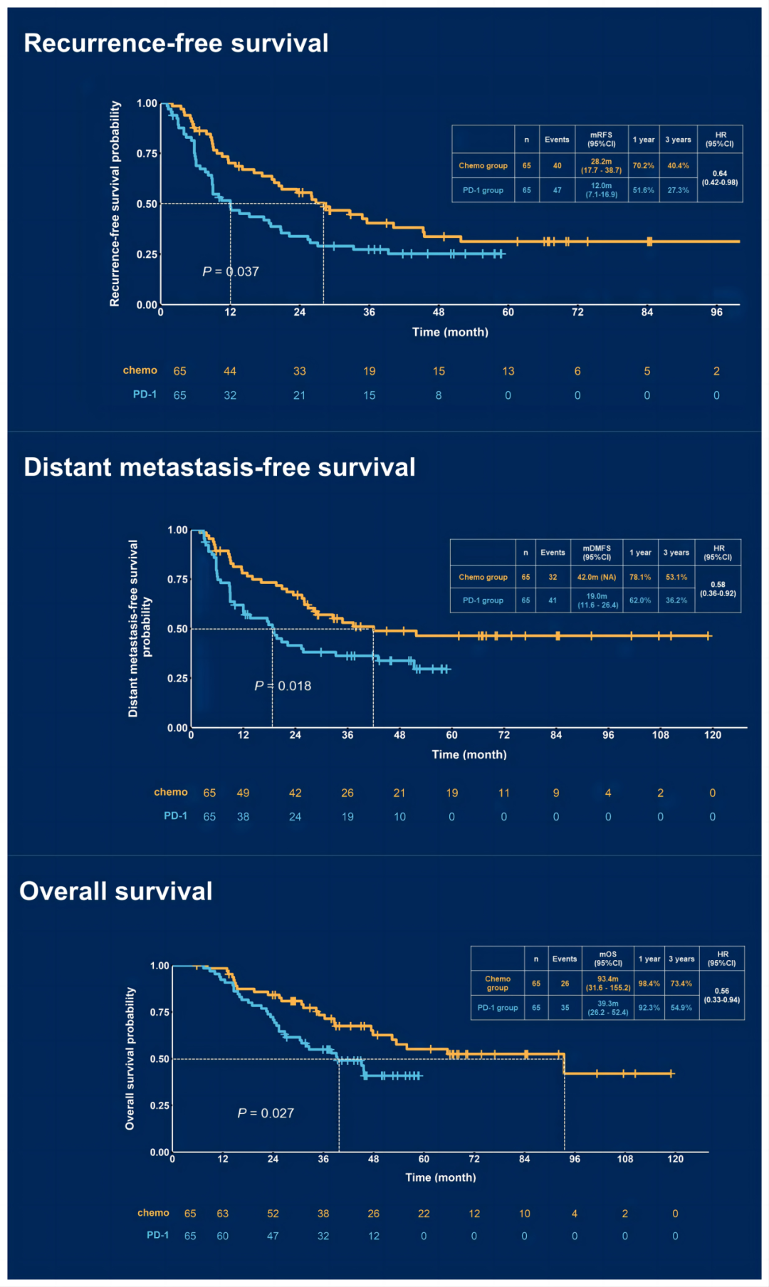 共纳入247例患者,其中特瑞普利单抗组78例,化疗组169例。对两组各65例患者进行了匹配。基线特征相似。在52.6个月(95%CI:44.6~60.6)的中位随访中,与特瑞普利单抗组相比,化疗组患者的中位RFS(28.2 vs.12.0个月;HR 0.64,95%CI:0.42~0.98,P=0.04),中位DMFS(42.0 vs.19.0个月;HR 0.58,95%CI:0.36~0.92,P=0.02)和中位OS(93.4 vs.39.3个月;HR 0.56,95%CI:0.33~0.94,P=0.03)均显著更长。