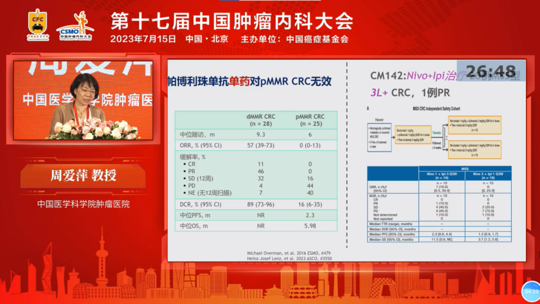 在安徽医科大学第一附属医院顾康生教授主持下,中国医学科学院肿瘤医院周爱萍教授作报告《MSS/pMMR结直肠癌免疫治疗探索之路》。这项报告主要介绍了免疫联合治疗对MSS/pMMR肠癌后线治疗有一定疗效,在一线治疗中也看到有获益人群存在。界定有效患者群体的分子和免疫特征,筛选优势人群是现有免疫治疗手段成功的关键。不同疾病阶段、不同的联合治疗手段,疗效相关因素不一,尚需进一步明确和整合模型。后线联合治疗可能相关的因素包括:肝转移、ctDNA、maxVAF、CNV和TME分型。一线治疗中免疫联合化疗+靶向的疗效相关因素包括:免疫评分,CMS分型。针对耐药机制的精准分子治疗策略有望克服免疫耐受。在围手术期应用免疫治疗可望发挥更大的作用。MSS/pMMR肠癌其他的探索方向包括菌群移植、TIL、CART等。