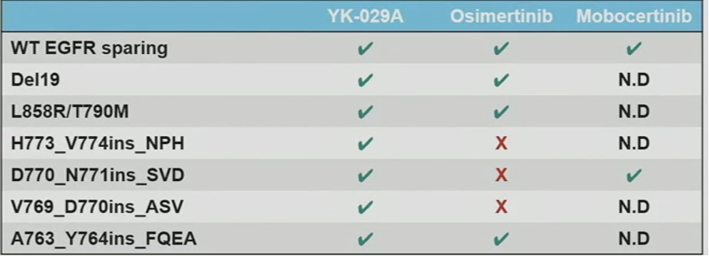 YK-029A是不可逆、特异性的第三代EGFR-TKI,体外研究显示对T790M和ex20ins各种突变均有活性。