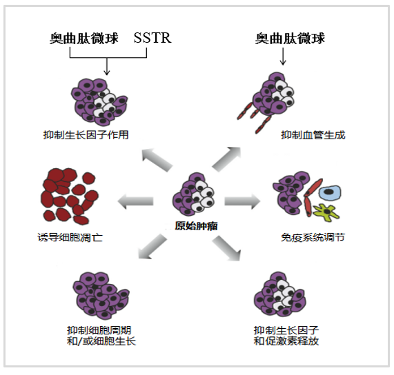 长效奥曲肽具有独特微球缓释技术而确保了稳定持久的疗效。2009年的PROMID研究结果不仅证实了药物具有抗激素分泌作用,还表明其可有效控制来自小肠肿瘤的生长,显著降低肿瘤进展风险达66%[5];同时其他多项NENs研究也表明[6,7],SSA药物奥曲肽微球对肿瘤兼具抗分泌和抗增殖的双重功能,因而成为该肿瘤领域非常重要的治疗药物。