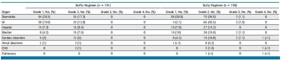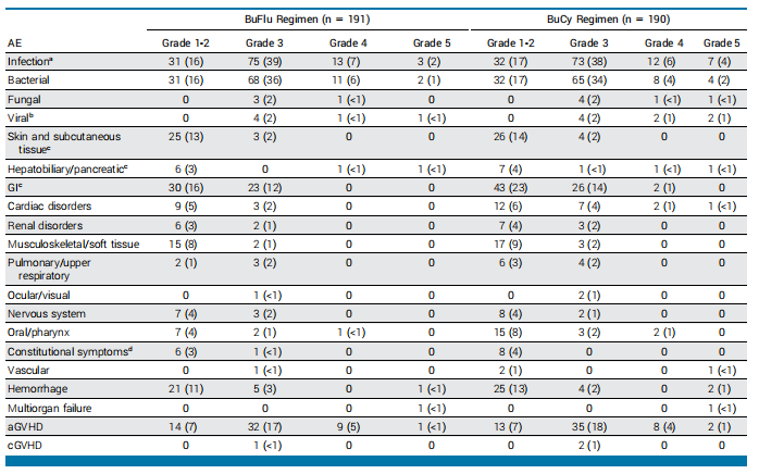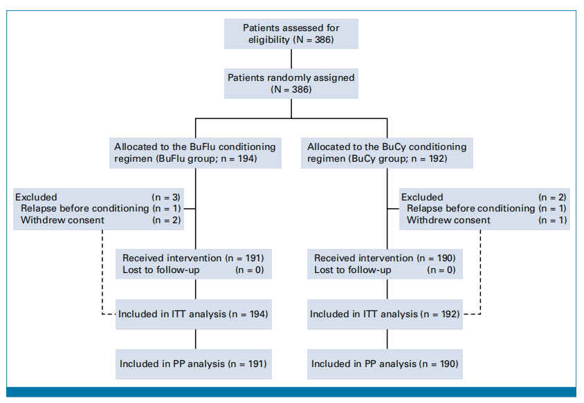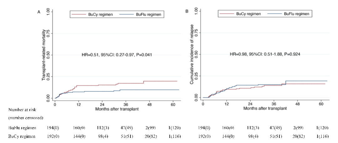 该研究共纳入AML患者386例,患者年龄18~65岁,HCT前处于完全缓解的AML(排除急性早幼粒细胞白血病),ECOG评分0~2分,无MSD和MUD但有单倍体供者、首次移植。按照1:1随机分为BuFlu或BuCy预处理组,其中BuFlu组194例、BuCy组192例。