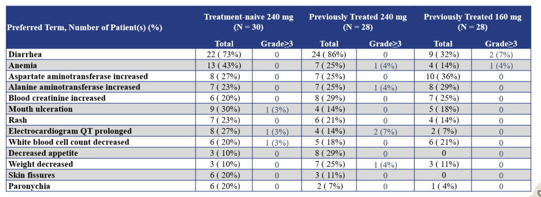 今年WCLC大会上,伏美替尼的初步结果令人鼓舞,ORR更新结果为78.6%,我认为剂量增加起到重要作用。在更难治突变类型患中,更高剂量取得的疗效较好,同时也探索了其在一线治疗中的疗效(见表1),目前III期FURMO-004临床研究正在开展中。本次韩教授公布的结果令人印象深刻,≥3级治疗相关不良事件很少发生(表2)。临床实践中应该及早处理不良事件。在近期学术会议上,有几项关于EGFR ex20ins突变的临床研究结果公布,而我对伏美替尼治疗EGFR ex20ins突变尤其感兴趣。在中国EGFR ex20ins突变发生率约3~4%,基于中国肺癌患者数量庞大,可以预测其下一步临床试验可顺利开展,期待未来几年的结果,也期待与大家合作。