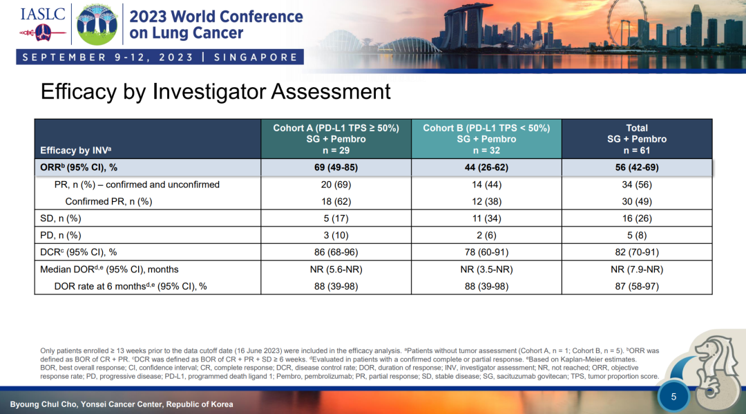 本次WCLC大会则主要针对队列A和队列B接的初步结果予以揭示,显示对两组总体患者群使用SG+帕博利珠单抗的ORR可达56%,6个月DoR率为87%,总体而言在疗效上取得了一定进展。该研究是Trop-2 ADC SG首次与帕博利珠单抗联合用于NSCLC的一线治疗,并根据NSCLC的PD-L1 TPS评分与组织学分类进行了分层,在研究设计阶段就反映了研究者遴选优势人群的想法,具有很强的借鉴意义。目前我们正在进行一项SG+帕博利珠单抗对比帕博利珠单抗单药用于NSCLC一线治疗的EVOKE-03研究,此项Ⅲ期临床研究主要针对PD-L1高表达NSCLC人群展开探索,目前正在进行中。期待EVOKE-02、03两项研究均能够取得良好的结果,为进一步提升一线治疗疗效添砖加瓦。