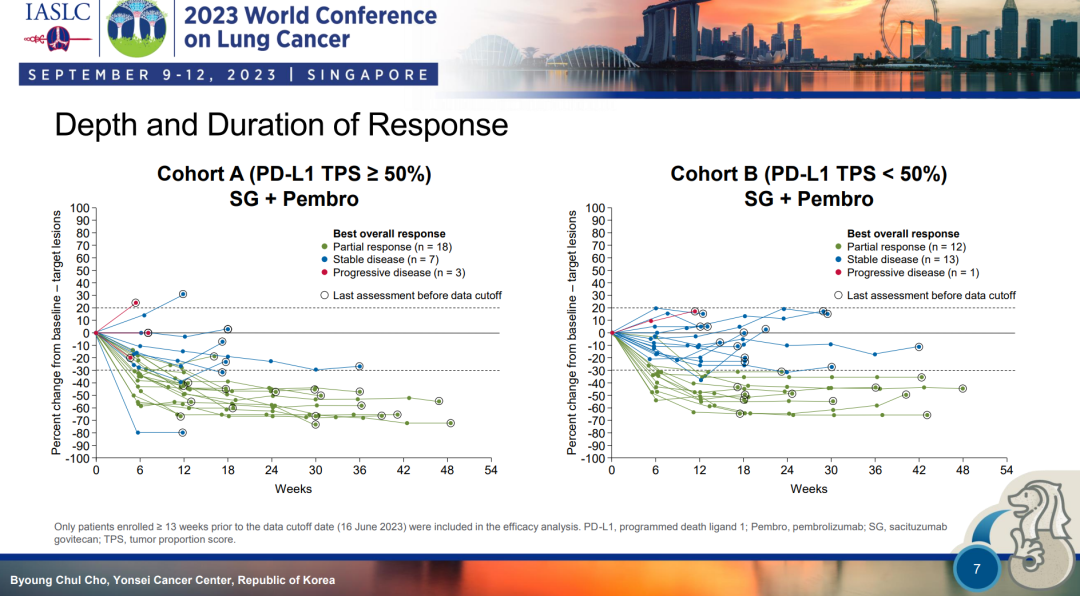 Prof.Liu:本次WCLC主要揭示了EVOKE-02四个队列中队列A和队列B的结果。两个队列探索了SG+曲妥珠单抗联合的可行性,队列A主要纳入PD-L1高表达人群,即PD-L1 TPS≥50%的患者。队列B为PD-L1低表达或阴性人群,即PD-L1<50%的患者,治疗后ORR为44%。目前这些数据并非随机数据,也没有设置直接的对照组。回顾历史数据来看,SG+帕博利珠单抗所取得的ORR似乎高于帕博利珠单抗单药治疗的既往数据。且两个队列mDOR均未达到,显示患者的缓解维持时间相当持久。观察蜘蛛图可发现,患者的对治疗的响应较快、缓解深度高、维持时间长。该结果让我们迫切地想知道在随机环境下,该方案是否能够优于当前的单药治疗方案。如今,我们已初步了解到SG+帕博利珠单抗可提升缓解率,免疫联合化疗同样也能提升缓解率,三者联合是否可以取得更优结果?假如能够进一步证实ADC可以改善长期疗效,延长患者的生存,并且在与免疫治疗药物联合时能够显示出协调作用,调用免疫细胞改善患者长期结局,于我而言,彼时才是ADC真正展现光明前景的时刻。