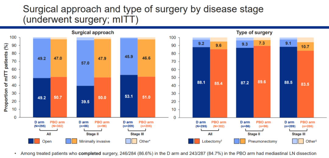 2023 WCLC发布了更全面的新辅助免疫治疗后手术结局数据和EGFR突变患者亚组的探索性分析结果。患者的手术结局非常好(在新辅助化疗基础上加入度伐利尤单抗,无论是在手术时机、手术完成率、手术时机及类型,均不会对肿瘤切除产生负面影响),没有新的安全性信号。在两个治疗组中,约一半的患者能够采用微创手术。我对开展这类临床试验的建议是,只要有可能,应该尝试使用微创手术(中国在这方面占主导地位),如果必须中转开胸手术,患者的手术治疗结局仍然非常好,但不建议一开始就进行开胸手术。