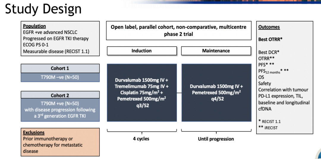 II期ILLUMINATE研究旨在确定在EGFR-TKIs治疗进展后的转移性EGFR突变肺癌患者中,双ICI疗法(度伐利尤单抗和tremelimumab)联合铂-培美曲塞化疗的疗效和耐受性。这项国际性、非比较性、双队列研究从澳大利亚的10个研究机构和中国台湾的6个研究机构招募了患者,分配到研究队列1(T790M阴性)或队列2(T790M阳性;三代EGFR-TKI治疗后病情进展)。受试者每3周接受度伐利尤单抗1500mg和tremelimumab 75mg联合铂-培美曲塞化疗(共4个周期),然后每4周接受度伐利尤单抗1500mg和培美曲塞500mg/m2维持治疗,直至疾病进展或对治疗不耐受。主要终点是客观缓解率(ORR)。次要终点包括疾病控制率(DCR)、无进展生存期(PFS)、12个月的无进展生存期率(PFS 12)和不良事件(AEs)。
