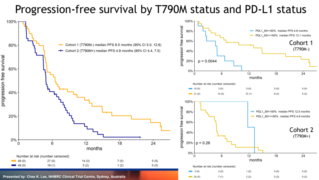 以PD-L1表达水平进行分层,在队列1可评估PD-L1患者中,肿瘤PD-L1<50%患者的mPFS为4.8个月,PD-L1≥50%患者为13.1个月;队列2肿瘤PD-L1<50%患者的PFS优于PD-L1≥50%的肿瘤(mPFS 12.5个月 vs 4.9个月)。在每个研究队列中,携带19号外显子缺失与21号外显子L858R患者的mPFS无明显差异。