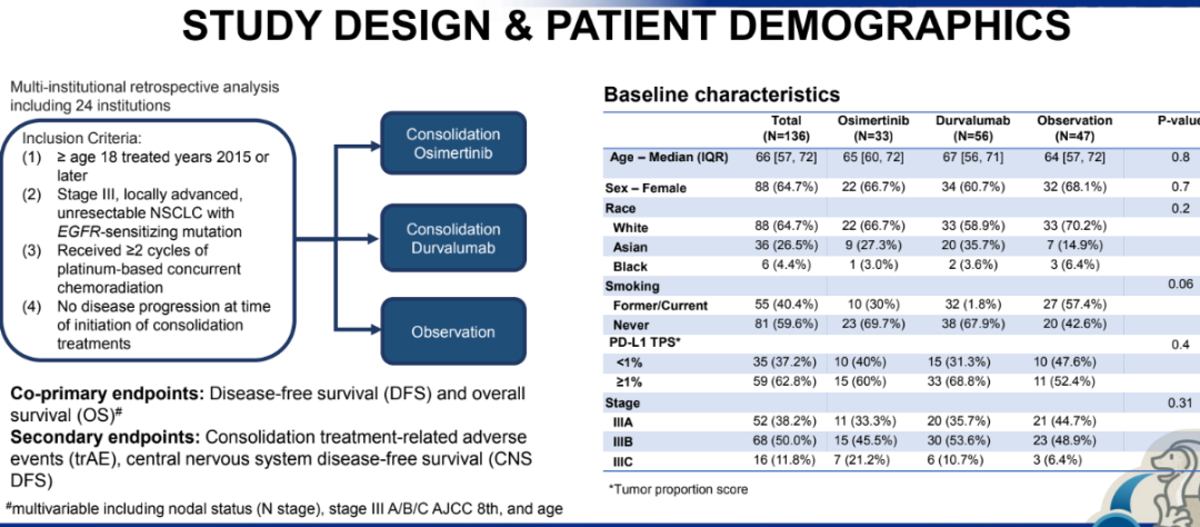 目前,不可切除III期NSCLC患者的标准疗法是同步放化疗(cCRT)序贯度伐利尤单抗巩固治疗。PACIFIC试验的事后分析表明,在EGFR突变型NSCLC患者中,度伐利尤单抗巩固治疗与安慰剂相比缺乏生存获益。目前尚缺乏在放化疗后不可切除的EGFR突变NSCLC患者中比较度伐利尤单抗和EGFR-TKI巩固性治疗的数据。在2023 WCLC发布的这项新研究中,研究人员分析了2015年至2022年期间接受治疗的89例III期EGFR突变NSCLC患者的结局。研究入组要求携带EGFR敏感突变的III期局部晚期不可切除NSCLC患者,若接受≥2个周期铂类同步放化疗后未发生进展,随后接受巩固性EGFR-TKI奥希替尼治疗、度伐利尤单抗治疗或进行观察。主要终点为无疾病生存(DFS)和总生存(OS)。