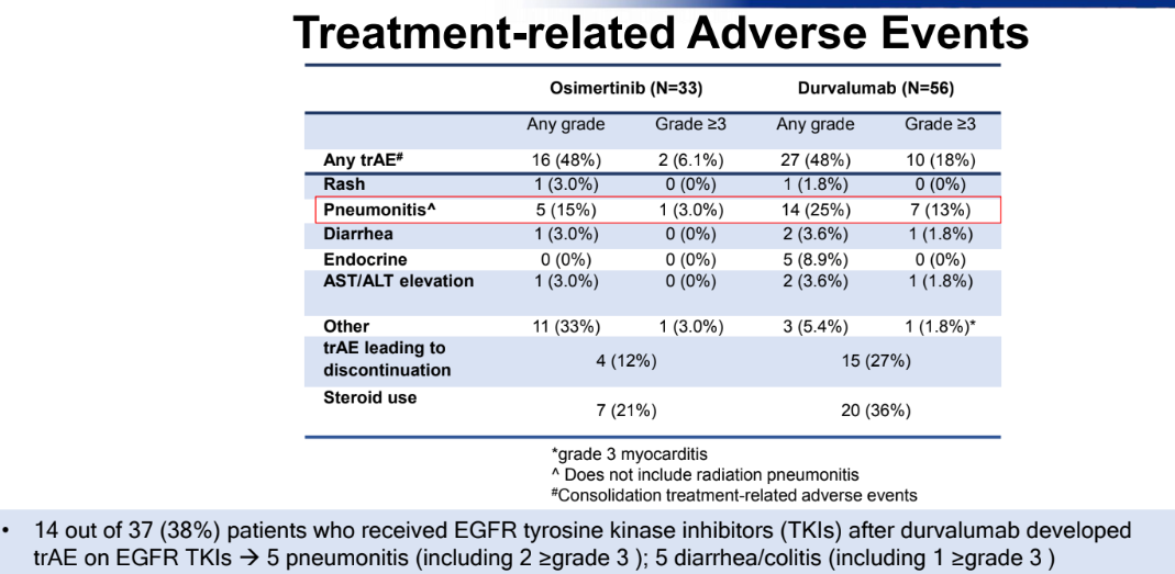 研究人员报道,在放化疗后接受EGFR-TKI或度伐利尤单抗,均有50%的患者发生任何级别治疗相关不良反应(TRAE)。然而,严重副作用发生率较低。