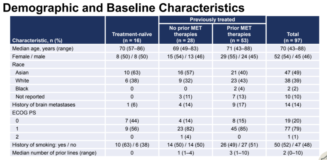 截至2023年6月19日,97例患者被纳入本试验METex14队列,中位随访10.0个月。在这些患者中,分别有16例、28例和53例为初治患者、既往未接受过MET抑制剂的经治患者以及既往接受过MET抑制剂的患者。既往治疗中常用的MET抑制剂包括卡马替尼和特泊替尼。