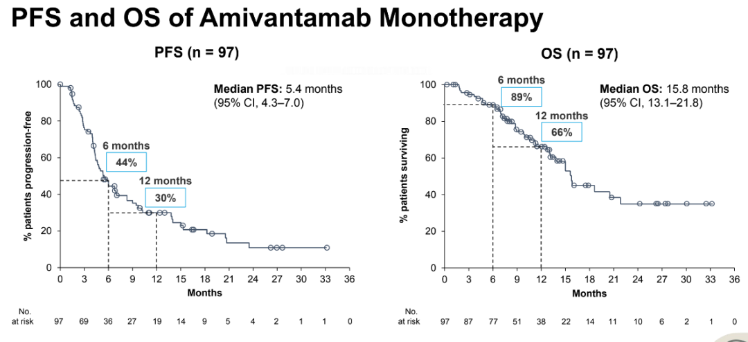 amivantamab单药治疗的中位无进展生存期(PFS)和总生存期(OS)分别为5.4个月(95% CI: 4.3~7.0)和15.8个月(95% CI: 13.1~21.8)。