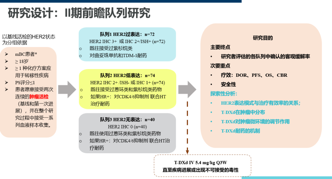 各队列具体患者入组标准请见下图。肿瘤组织活检在基线和T-DXd耐药时是必须的,在治疗期间是可选择进行活检但不是必须的。患者接受T-DXd 5.4mg/kg Q3w进行治疗,直至疾病进展或出现不可耐受的毒性。研究主要终点为确认的ORR。