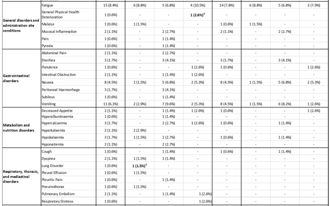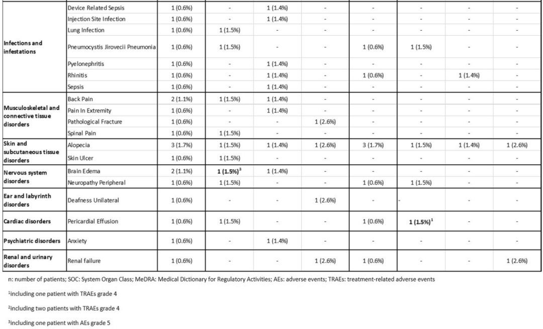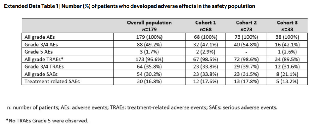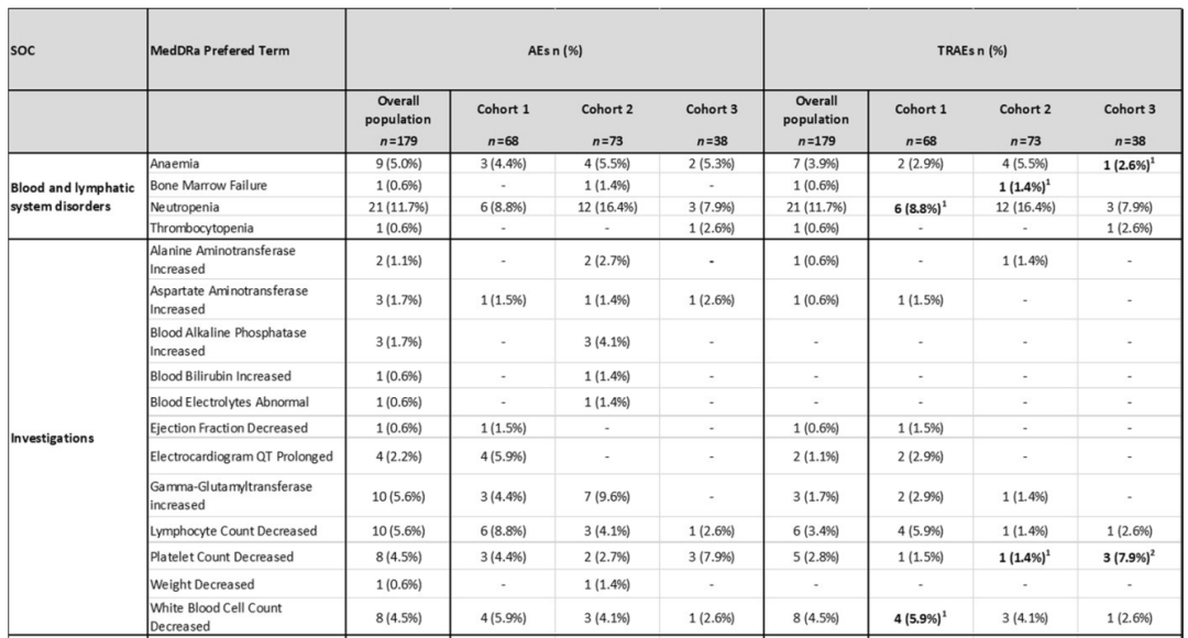 安全性方面,总共有145例(81%)患者永久停止治疗,其中队列1:49例(72.1%),队列2:61例(83.6%),队列3:35例(92.1%)。在这145例患者中有125例(86.2%)患者因疾病进展而停药,13例(9%)患者因毒性而停药。本研究中观察到的不良事件与先前的数据一致,≥3级最常见的不良反应是中性粒细胞减少(12%)、疲劳(8%)和呕吐(6%),这与TOP1抑制剂的毒性特征一致。9例患者(5%)表现为间质性肺疾病或肺炎,大多数为1级或2级。3例(1.7%)患者出现射血分数下降(1例3级)。3例(1.7%)患者出现5级不良反应,但无药物相关的5级不良事件。