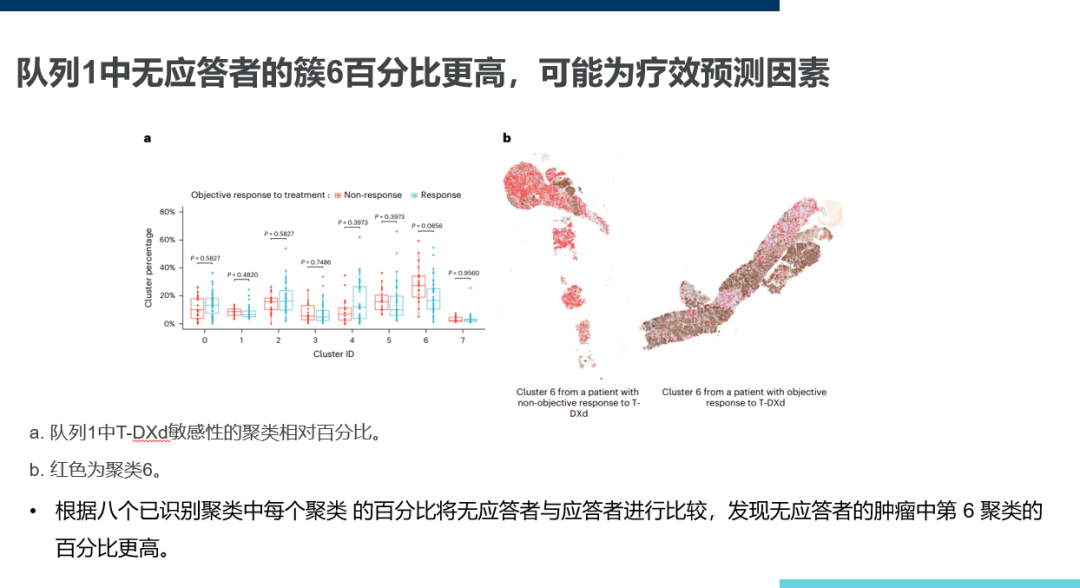 研究者进一步检测了三个队列的HER2表达模式,进行了HER2表达及其空间分布对药物疗效影响的探索性分析。首先评估了HER2空间分布是否可预测HER2过表达患者的药物治疗反应。研究者采用电子病理学及机器学习的聚类算法将HER2病理切片分割成8个簇。根据已确定的8个簇每个簇的百分比,比较无T-DXd应答者与T-DXd应答者,发现无应答者在簇6中的百分比更高[P=0.011,经错误发现率(FDR)校正的P=0.086],除簇6外未发现其他簇有组间统计学显著差异。簇6的特征是HER2染色低和中等细胞密度(37%的斑块没有细胞,34%的斑块有一个细胞核)。簇6斑块中存在的细胞主要是成纤维细胞和免疫细胞。