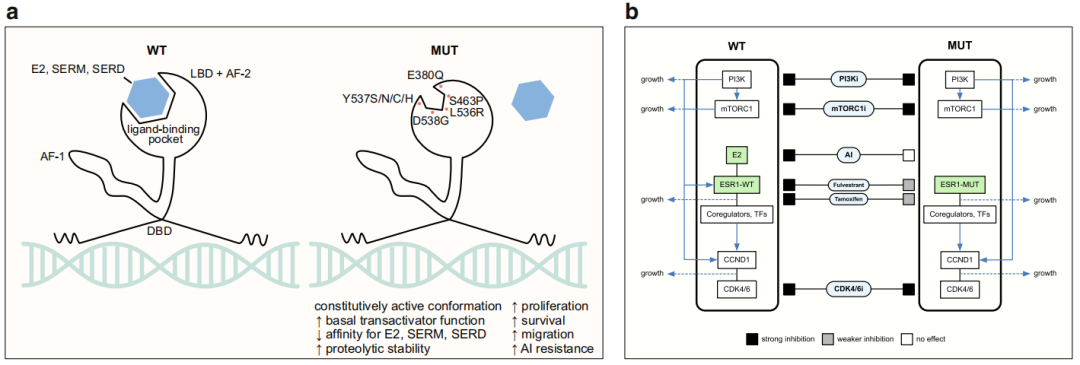 由于对ER结构和信号传导的丰富基础知识,以及正在进行的基于机制的药物开发,我们现在对ESR1突变的分子后果有了很多了解(图1)。ESR1突变产生耐药性的最简单机制是组成型活性。野生型ESR1(ESR1-WT)与雌激素配体结合,从而实现共激活因子募集,而LBD突变的ESR1(ESR1-MUT)具有组成型活性,因此不受雌激素的AI耗竭影响。在没有配体的情况下,与ESR1-WT相比,ESR1-MUT活性构象的稳定性增加,与共激活因子的结合增加,蛋白水解降解减少。