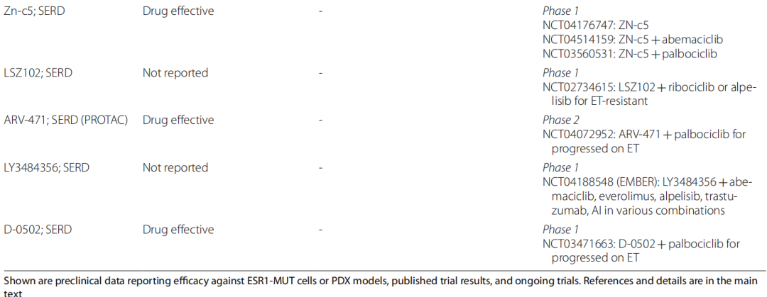 新型SERM和SERCAs已经被开发出来,并针对ESR1-MUT进行了特异性测试(表2)。Lasofoxifene(拉索昔芬)是一种最初为骨质疏松症开发的SERM,被发现在ESR1-MUT的人群中可降低乳腺癌发病率[31]。对于ESR1-MUT患者以及ET和CDK4/6抑制(CDK4/6i)进展后的患者,拉索昔芬目前正在进行相关试验(ELAINE:NCT03781063,ELAINE-2:NCT04432454)。Bazedoxifene(巴多昔芬)是一种SERM/SERD杂合物,除了调节协同调节因子与ER的结合外,还会导致ER降解,但这只发生在WT和D538G,而不是Y537S[32]。在ESR1-MUT乳腺癌细胞中,巴多昔芬比他莫昔芬和氟维司群更有效,并且在他莫昔芬耐药细胞和患者来源的异种移植(PDX)模型中有效[32,33]。巴多昔芬已经被批准用于治疗绝经后的潮热和骨质疏松症,目前正在进行一项用于ET疾病进展患者的2期试验(NCT02448771)。H3B-6545是一种经过优化的SERCA类药物,它通过靶向S530共价使ESR1失活[23],在1期研究中,H3B-6545对ESR1-mut MBC以及之前接受ET和CDK4/6i[47]治疗的MBC有效。H3B-6545目前正在对ET和CDK4/6i进展后的患者进行2期试验(NCT03250676)[34]。