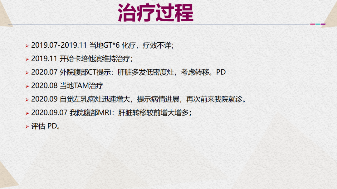 该例患者应用CDK4/6抑制剂+AI的方案出现疾病进展,因为肿瘤异质性的存在,患者的分型可能存在差异,因此,我认为对于该患者应重新进行活检,并推荐其进行基因检测。若患者拒绝行基因检测,我可能会根据患者身体的情况,应用化疗方案降低患者的肿瘤负荷,后续再行内分泌+靶向维持治疗,后线治疗会选择ADC类药物。