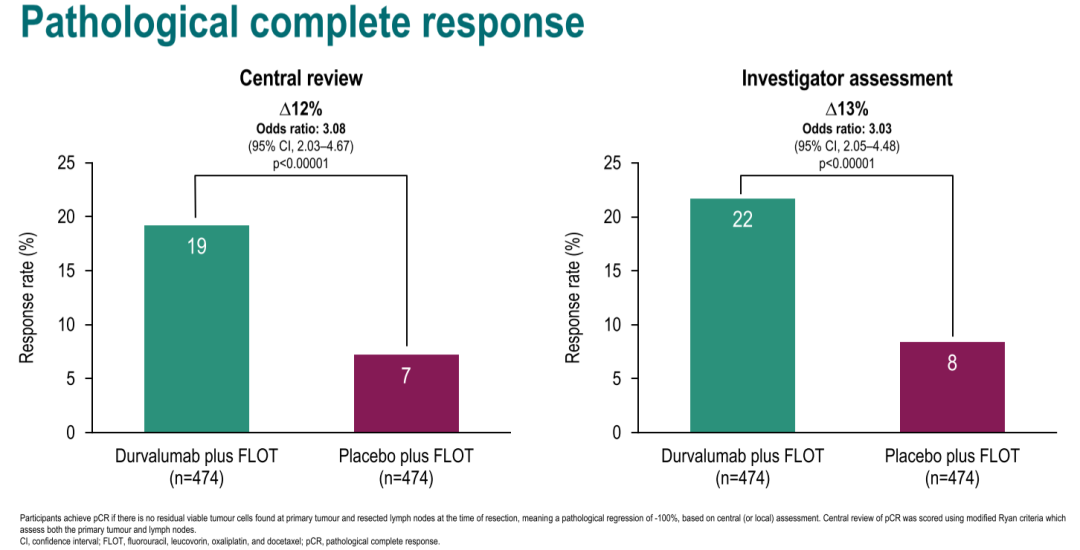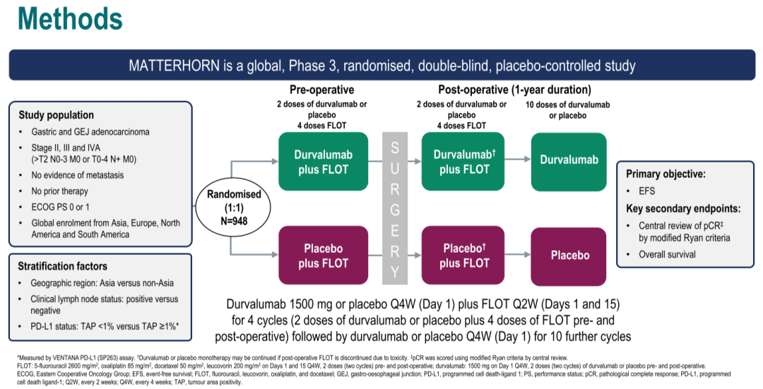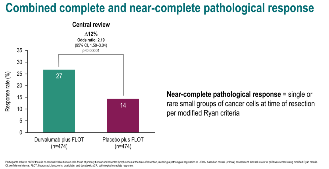 度伐利尤单抗联合5-氟尿嘧啶、亚叶酸钙、奥沙利铂和多西他赛(FLOT)治疗可切除胃和胃食管结合部腺癌(GC/GEJC)的病理完全缓解(pCR):全球Ⅲ期MATTERHORN研究的中期结果(摘要号:LBA73)[1]