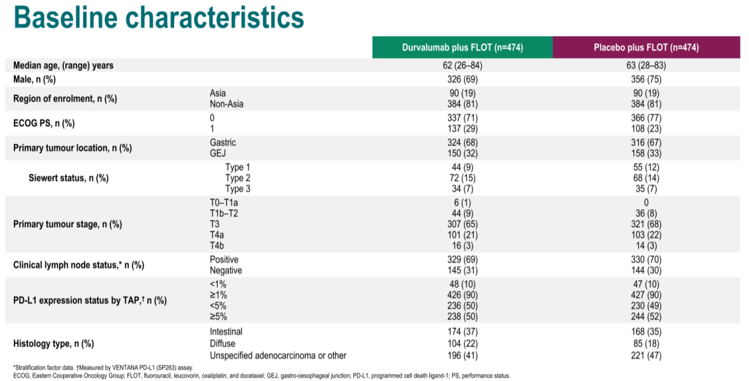 入组可切除(>T2N0-3M0/T0-4N1-3M0)GC/GEJC患者,随机(1:1)分配至度伐利尤单抗组或安慰剂组。度伐利尤单抗组患者术前和术后均接受2个周期度伐利尤单抗(1500mg,D1,Q4W)或安慰剂联合FLOT(D1/D15,Q4W),围术期治疗后序贯10个周期的度伐利尤单抗或安慰剂(D1,Q4W)辅助治疗。研究的主要终点是意向性治疗人群(ITT)的无事件生存期(EFS),关键次要终点包括病理完全缓解率(pCR)和总生存期(OS)。在所有随机患者接受或排除手术后进行预设IA,通过中央审查(改良Ryan)评估pCR率的优效性(双侧α=0.1%),同时评估手术和安全性结果。