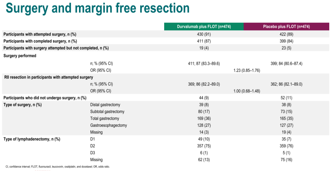 度伐利尤单抗组和安慰剂组的手术切除率分别为87%和84%;在接受手术的患者中,度伐利尤单抗组和安慰剂组的R0切除率均为86%;但度伐利尤单抗组的分期降级率高于安慰剂组(pT0:23%vs 11%;pN0:52%vs 37%)。