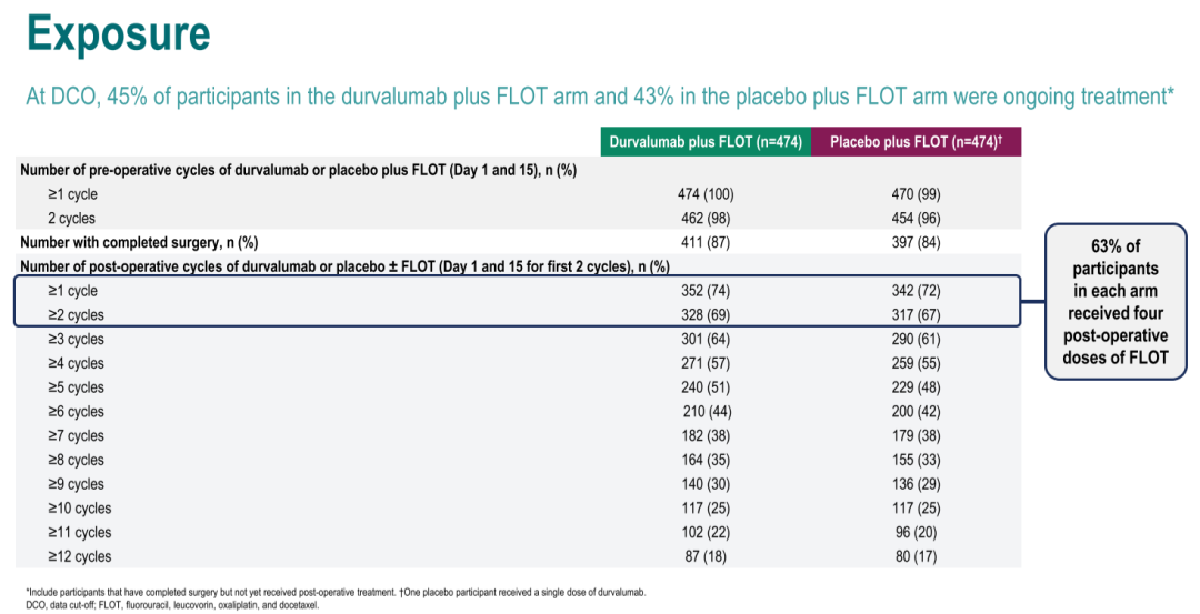 两组患者的中位暴露时间相似。不良事件发生率相似,度伐利尤单抗组和安慰剂组3/4级不良事件发生率分别为69%和68%。