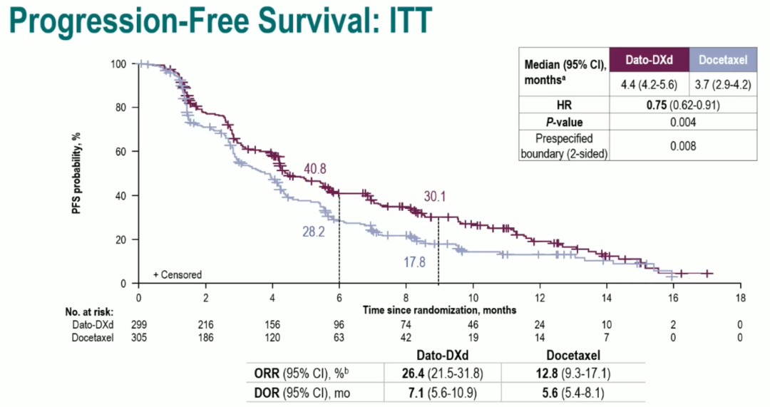 在ITT人群中,Dato-DXd组和多西他赛组的中位PFS分别为4.4个月和3.7个月,Dato-DXd组患者的疾病进展或死亡风险相较于多西他赛组显著降低25%(HR 0.75,95%CI:0.62~0.91,P=0.004)。Dato-DXd组患者确认的ORR为26.4%,相较于多西他赛组(12.8%)提高一倍。