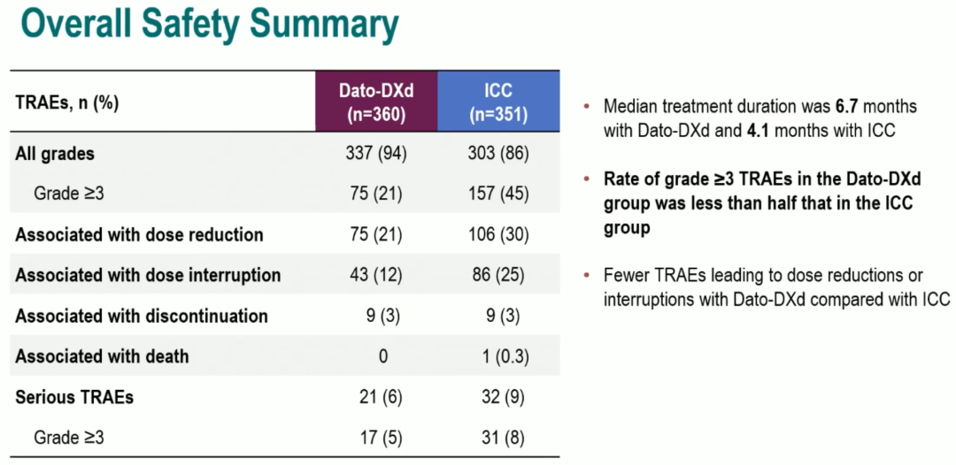 与ICC组相比,Dato-DXd组患者的≥3级TRAEs(21%vs 45%)以及导致剂量减少的TRAEs(21%vs 30%)发生率更低。Dato-DXd组有9例(3%)患者发生不同级别的ILD,仅有1例为3级ILD。