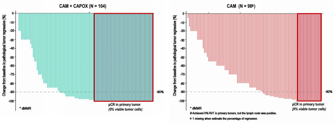 CAM+CAPOX组中位肿瘤退缩率为98%,CAPOX组中位肿瘤退缩率为85%。